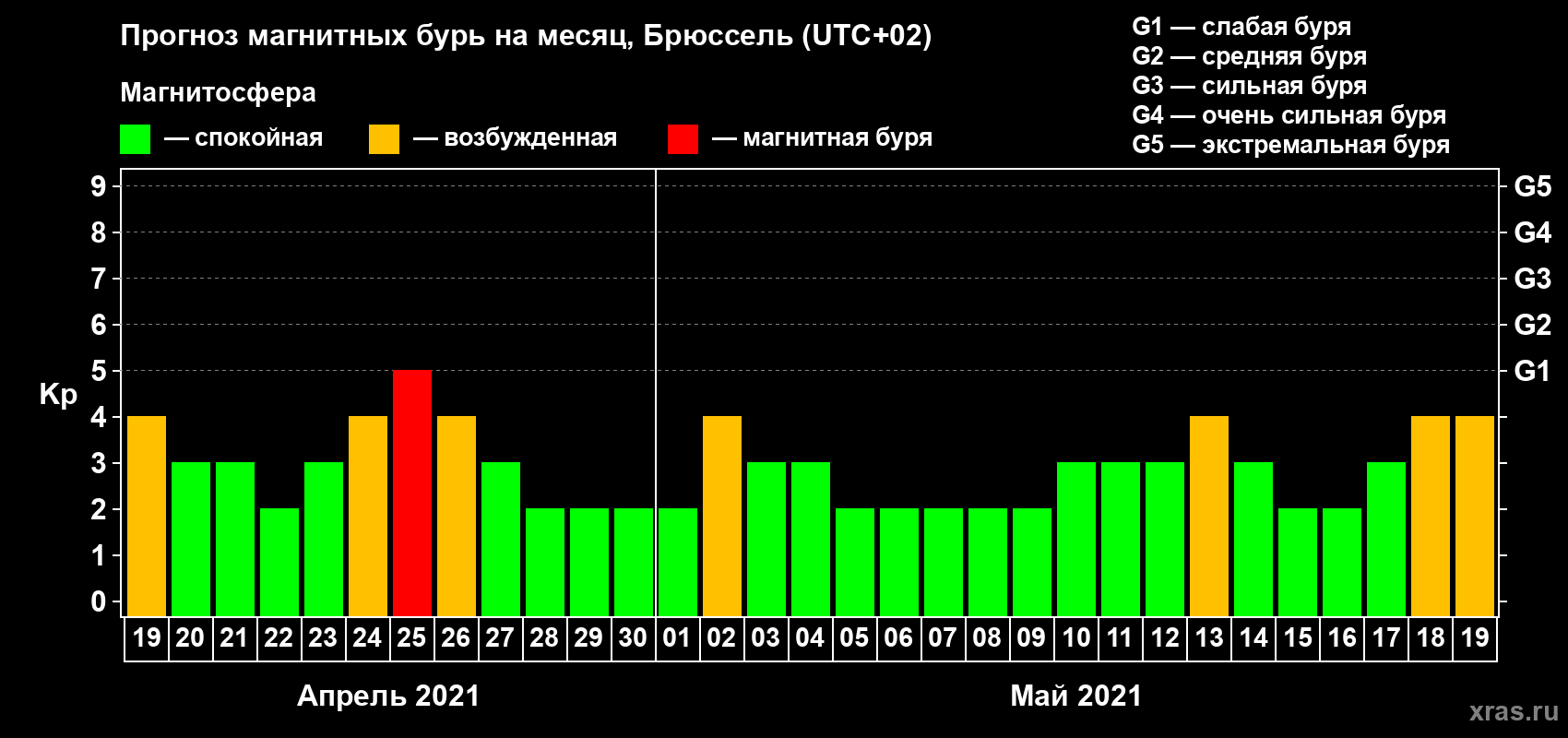 Прогноз магнитных бурь в Брюсселе — 19 апреля 2021 года