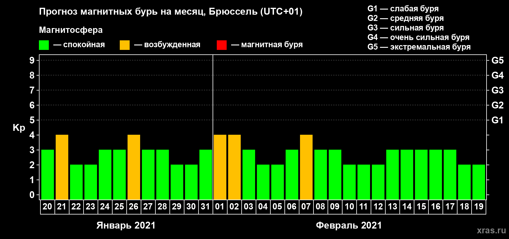 Прогноз магнитных бурь в Брюсселе — 20 января 2021 года