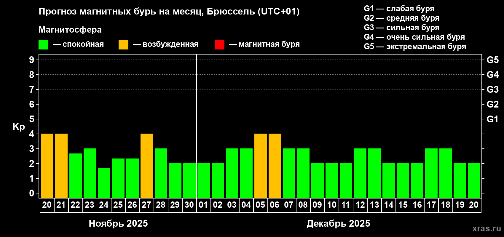 Прогноз магнитных бурь в Брюсселе — 20 ноября 2025 года
