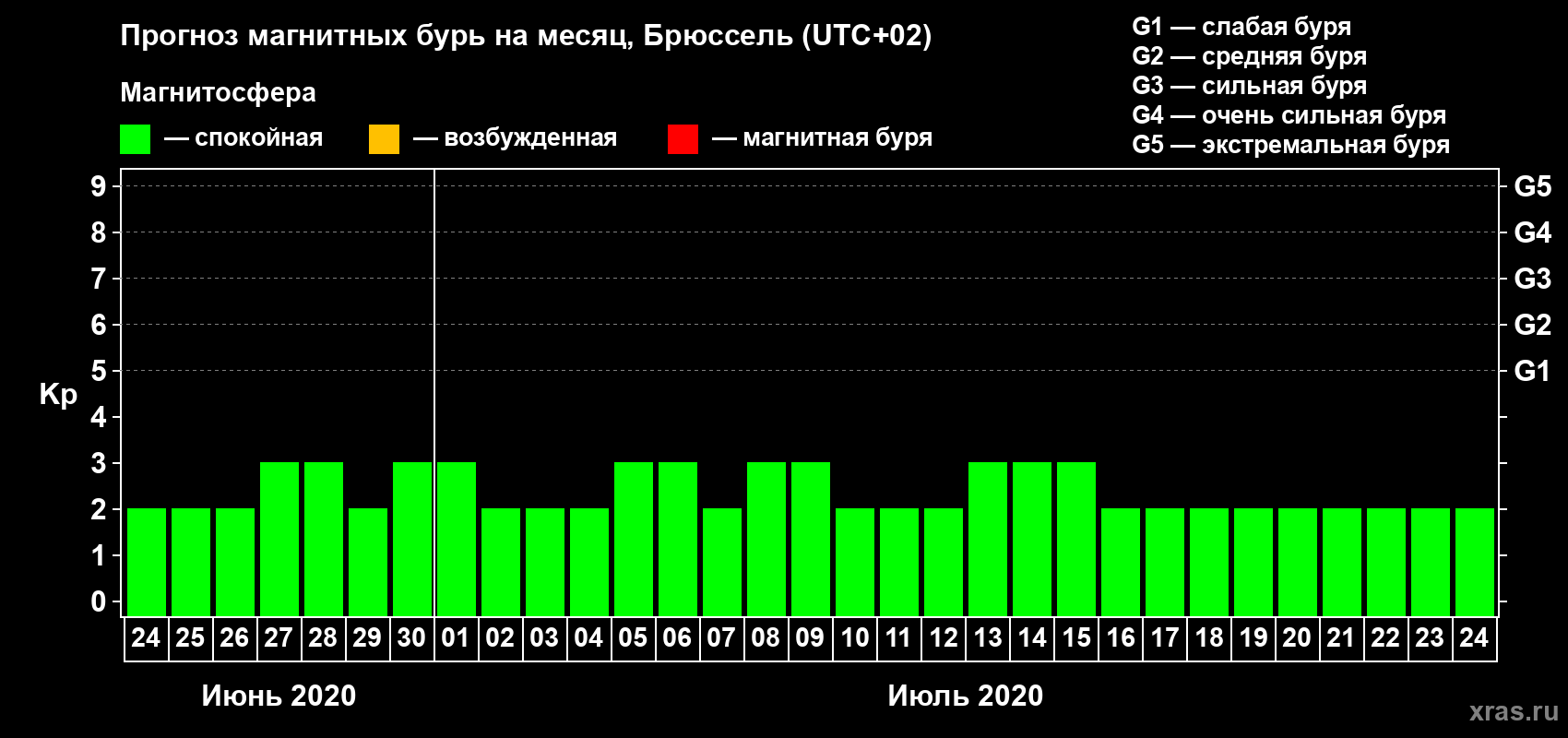 Прогноз магнитных бурь в Брюсселе — 24 июня 2020 года