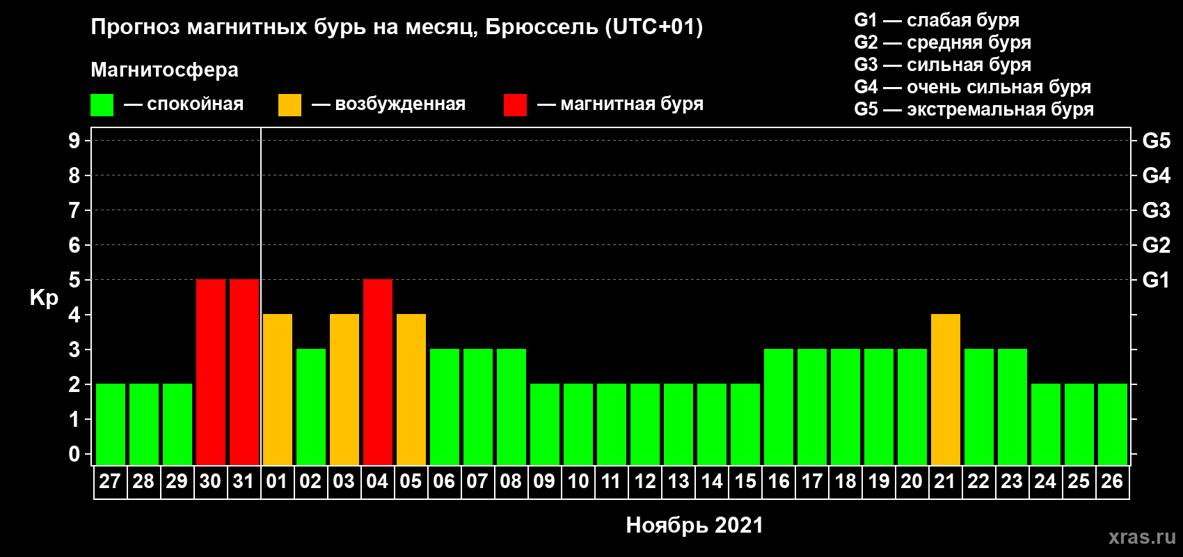 Прогноз магнитных бурь в Брюсселе — 27 октября 2021 года