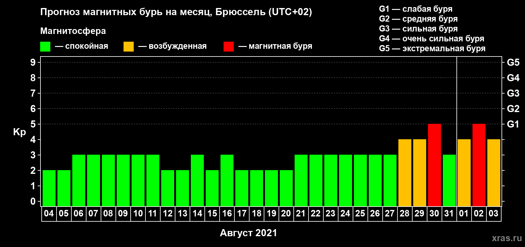 Прогноз магнитных бурь в Брюсселе — 4 августа 2021 года