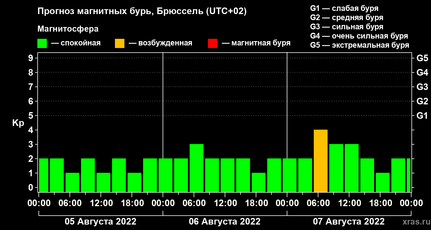 Прогноз магнитных бурь в Брюсселе на 5 августа 2022 года