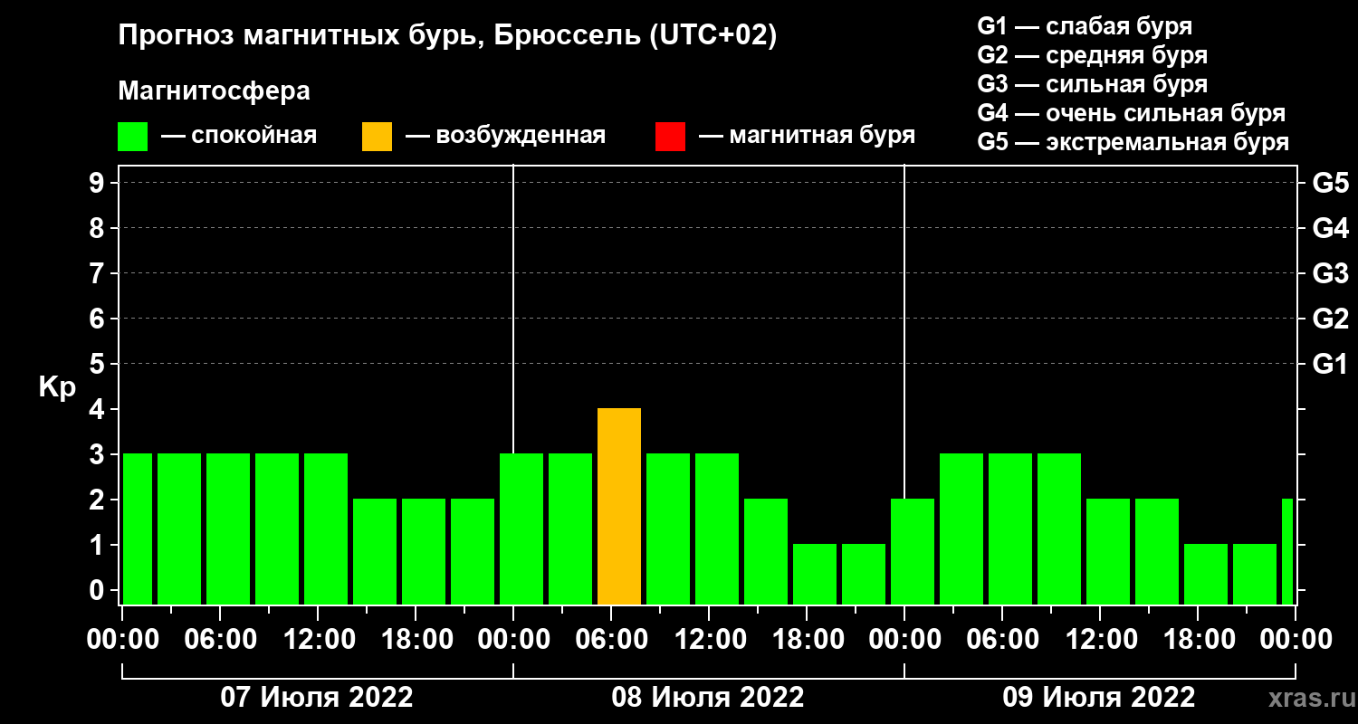 Прогноз магнитных бурь в Брюсселе — 7 июля 2022 года