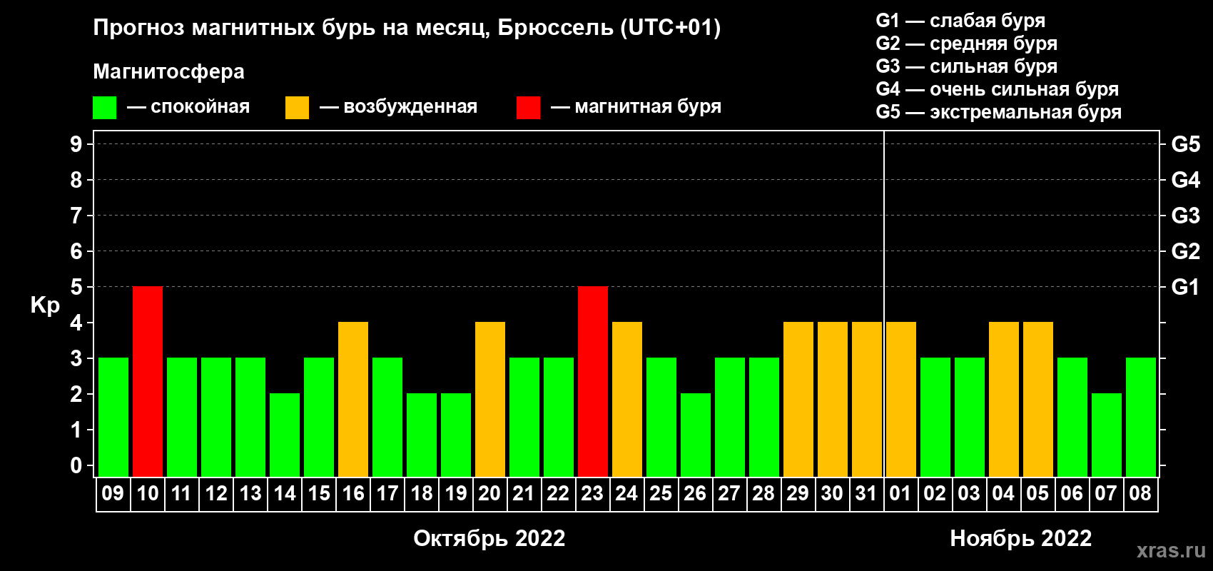 Прогноз магнитных бурь в Брюсселе — 9 октября 2022 года