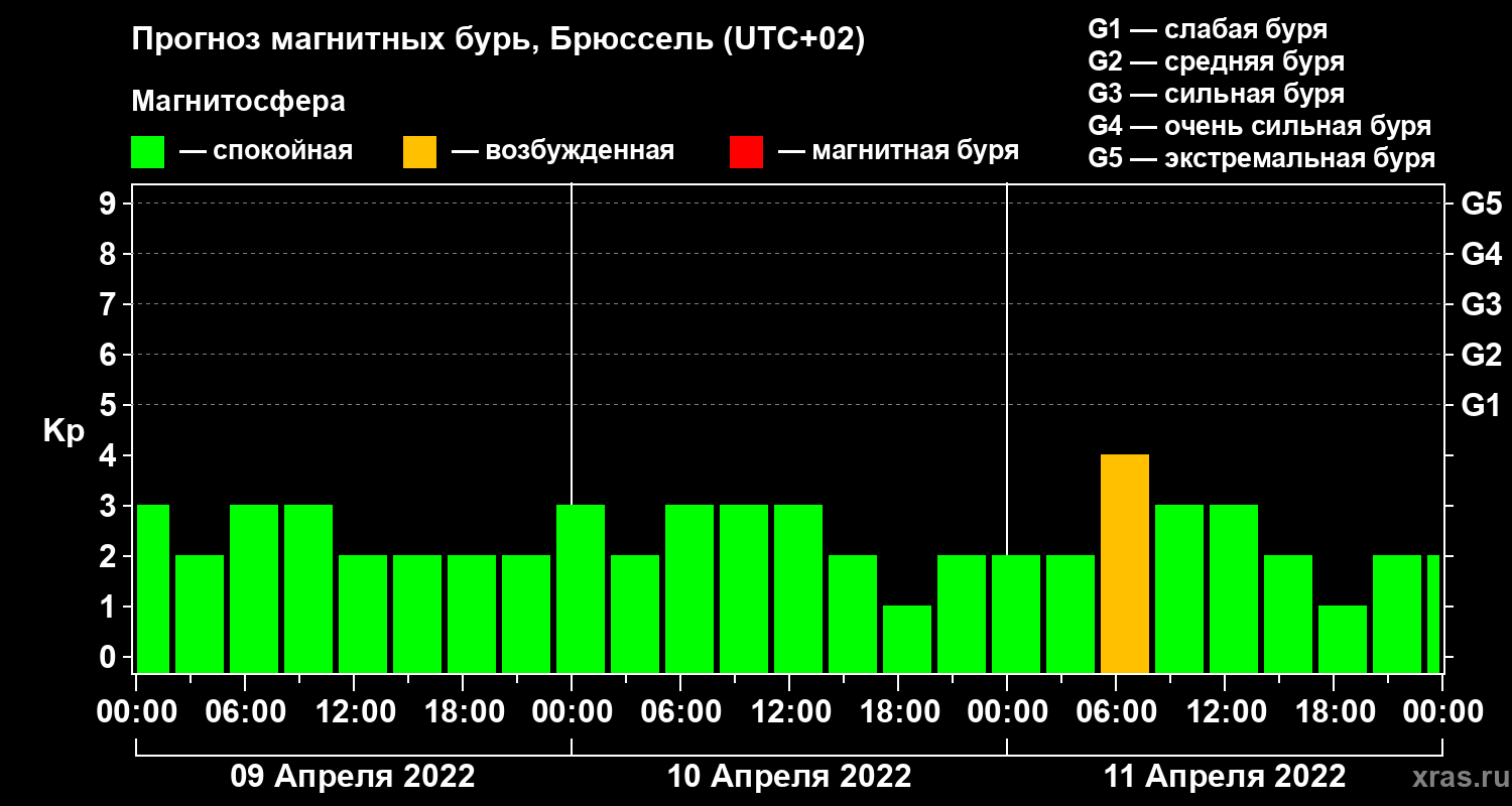 Прогноз магнитных бурь в Брюсселе — 9 апреля 2022 года
