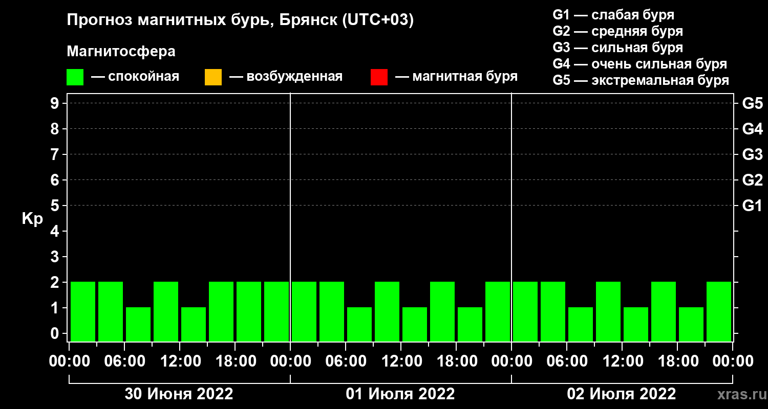 Прогноз магнитных бурь в Брянске на 30 июня 2022 года