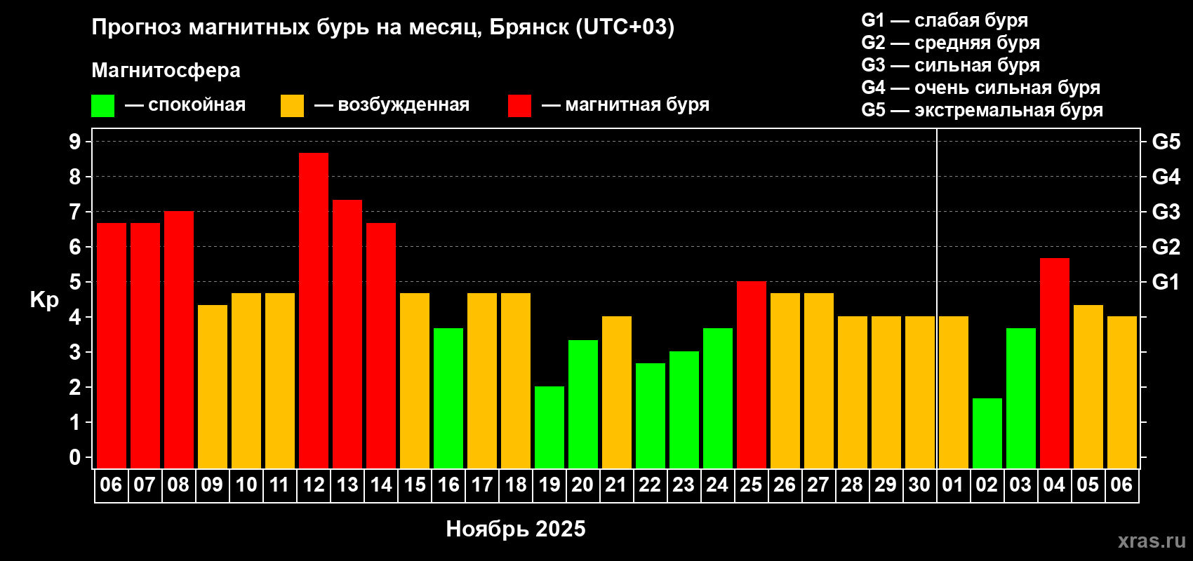 Прогноз магнитных бурь в Брянске — 6 ноября 2025 года