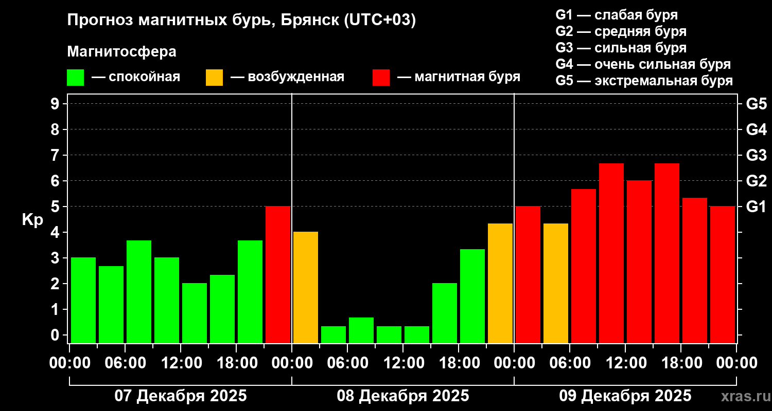 Прогноз магнитных бурь в Брянске — 7 декабря 2025 года