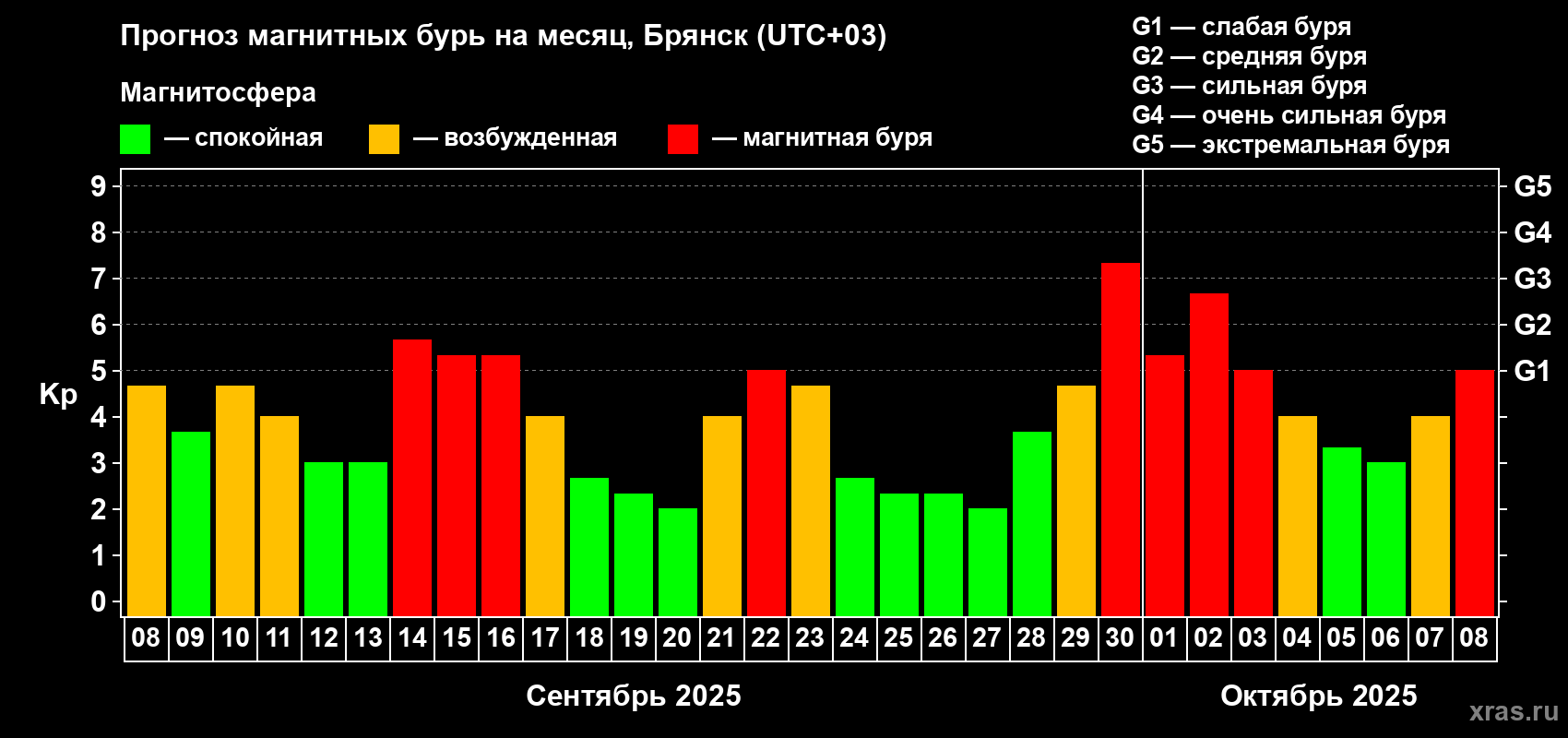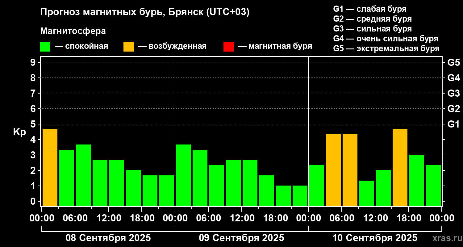 Прогноз магнитных бурь в Брянске на 8 сентября 2025 года