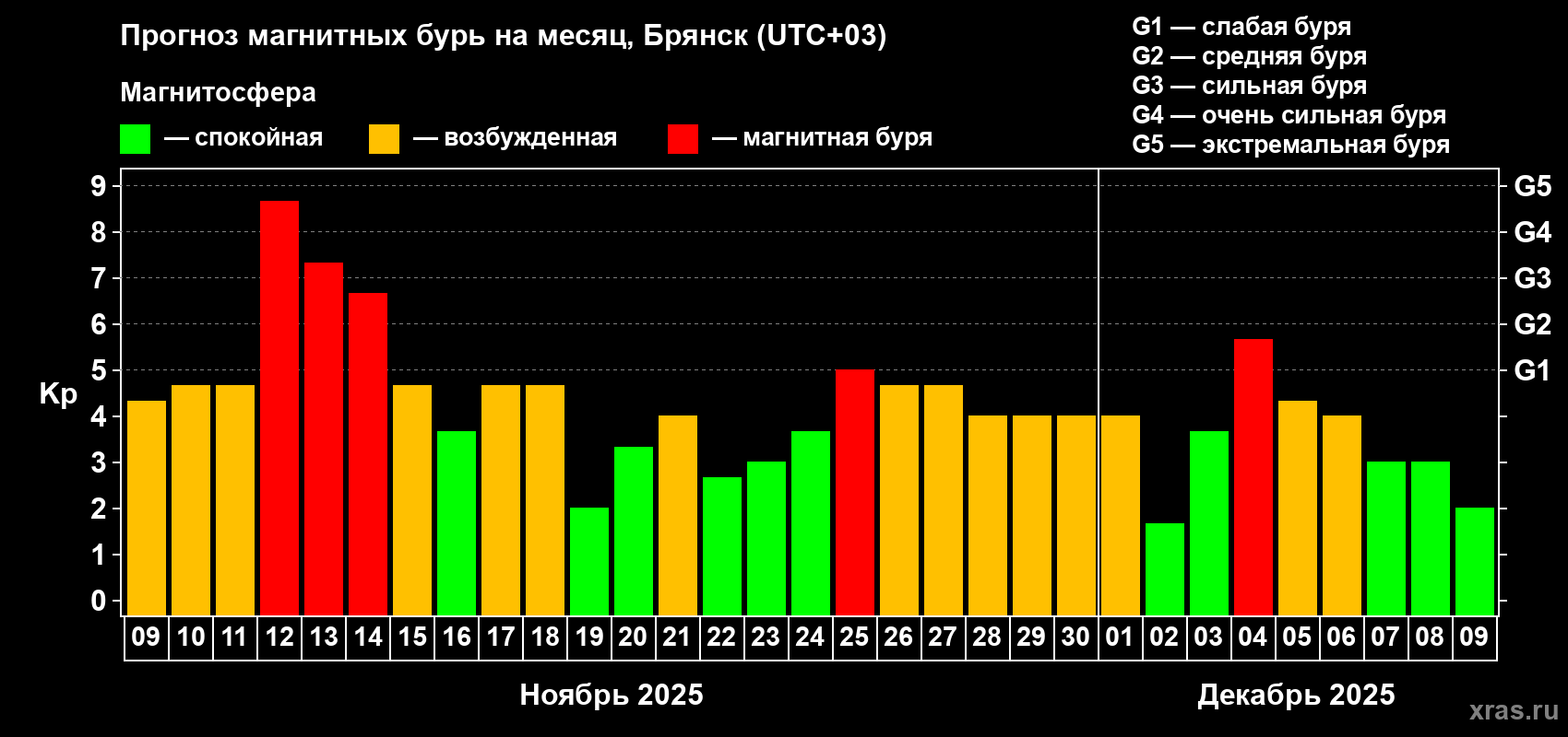 Прогноз магнитных бурь в Брянске на 9 ноября 2025 года