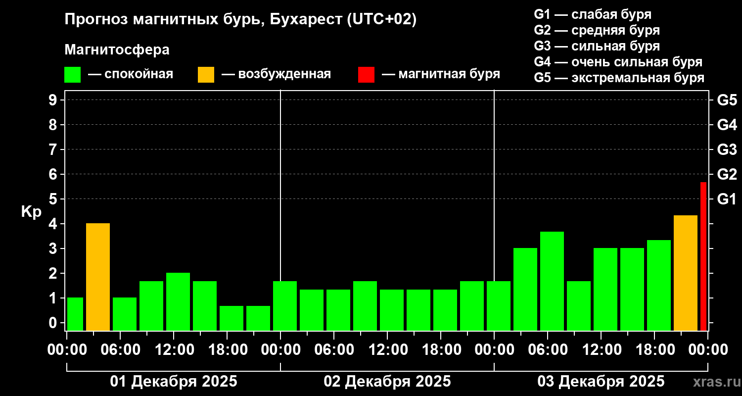 Прогноз магнитных бурь в Бухаресте — 1 декабря 2025 года