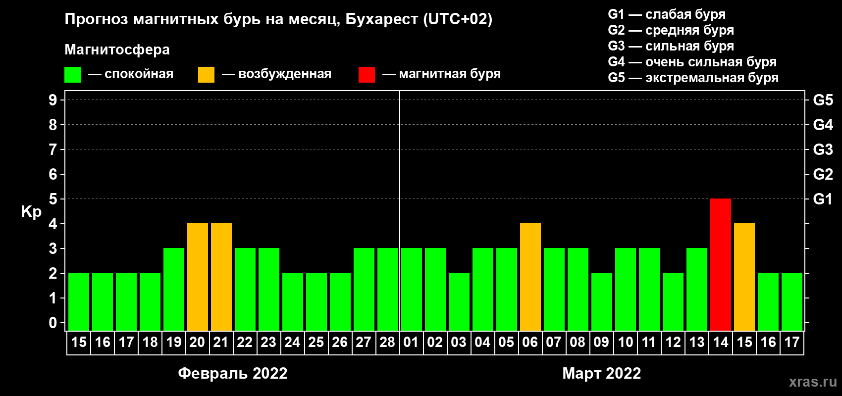 Прогноз магнитных бурь в Бухаресте — 15 февраля 2022 года