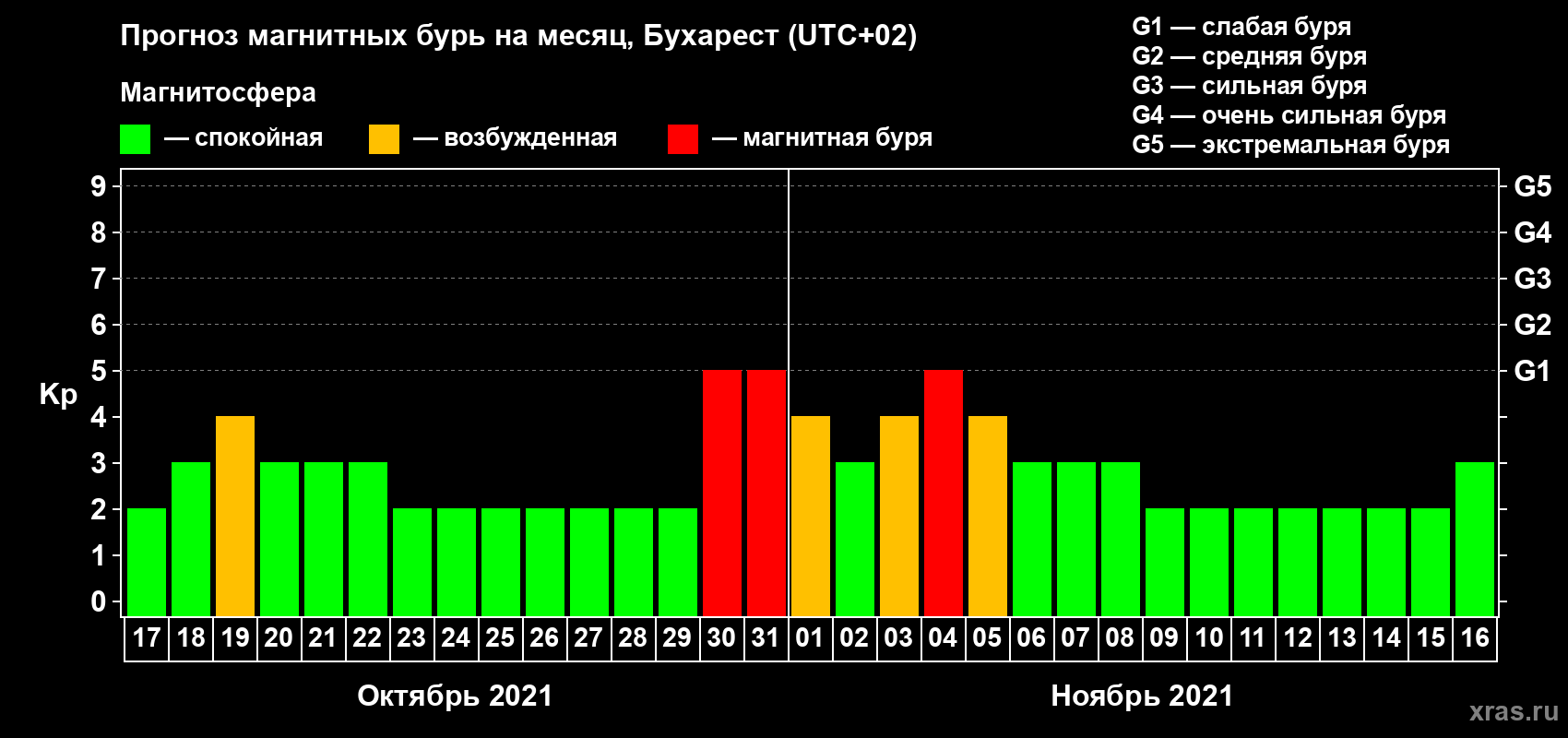 Прогноз магнитных бурь в Бухаресте — 17 октября 2021 года