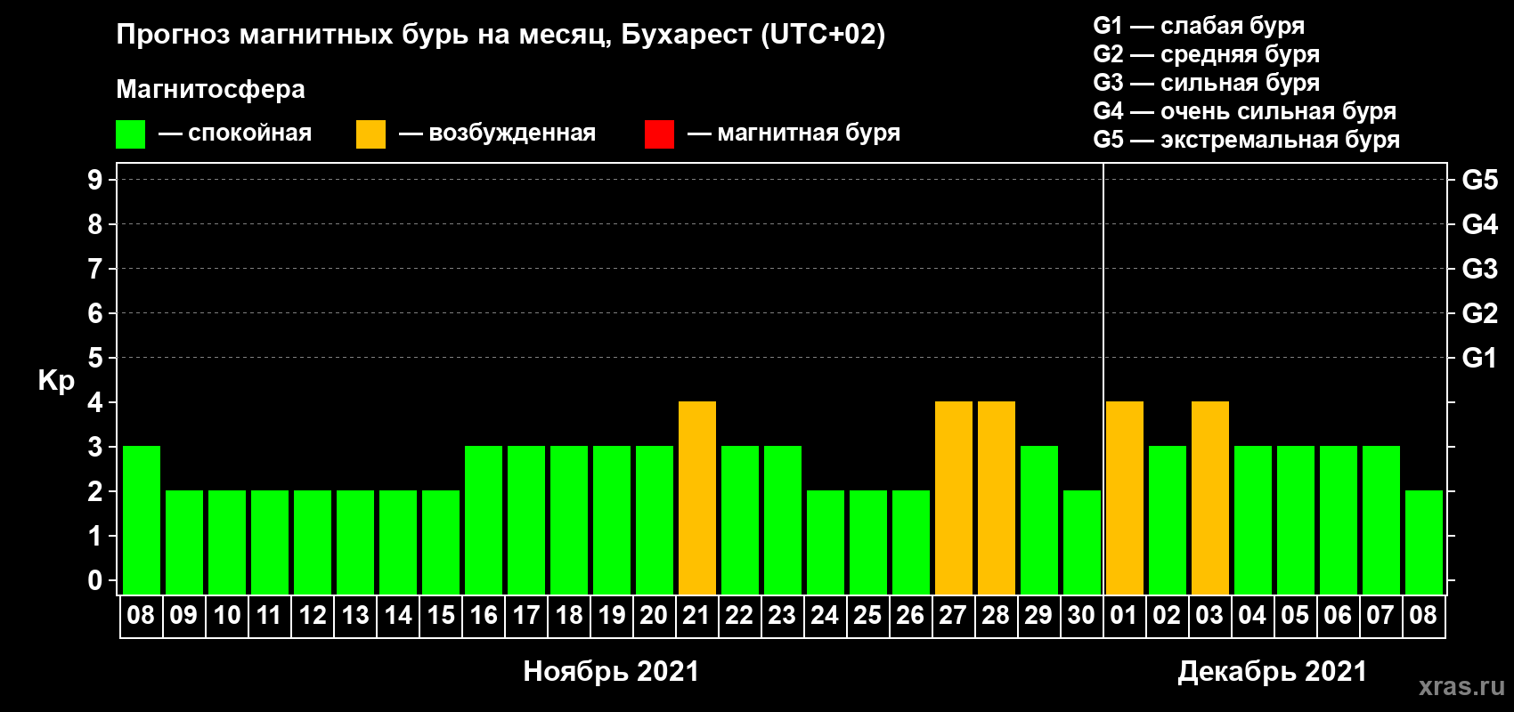 Прогноз магнитных бурь в Бухаресте — 8 ноября 2021 года