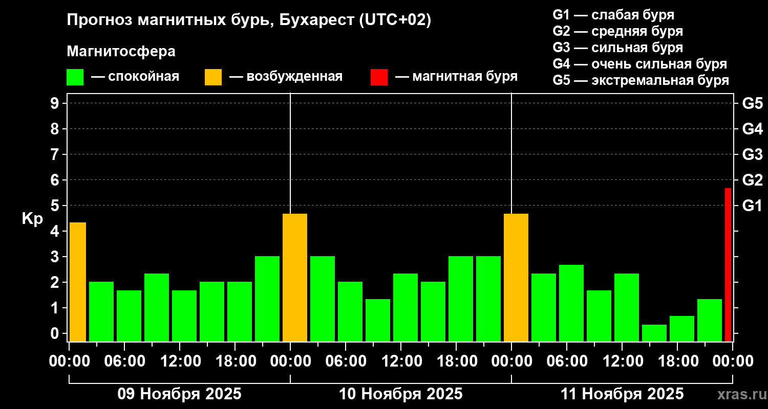 Прогноз магнитных бурь в Бухаресте — 9 ноября 2025 года