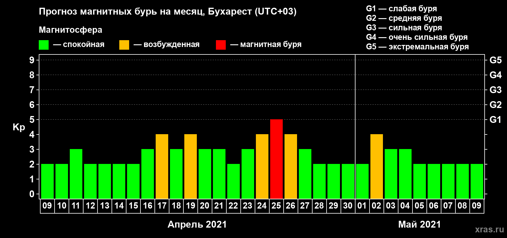 Прогноз магнитных бурь в Бухаресте — 9 апреля 2021 года