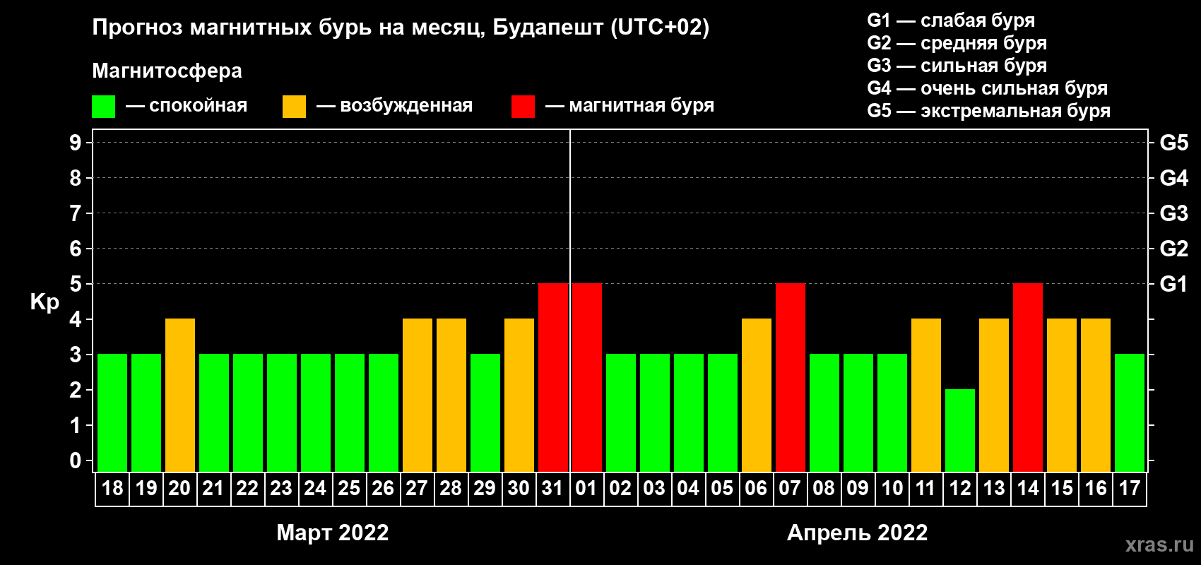 Прогноз максимального суточного геомагнитного индекса Kp на 1 месяц (31 день) с 18 марта по 17 апреля 2022 г