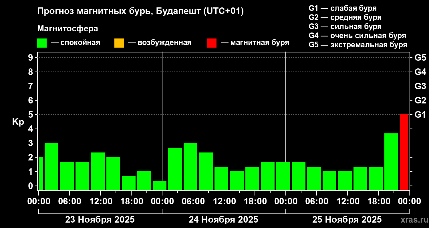 Прогноз магнитных бурь в Будапеште — 23 ноября 2025 года