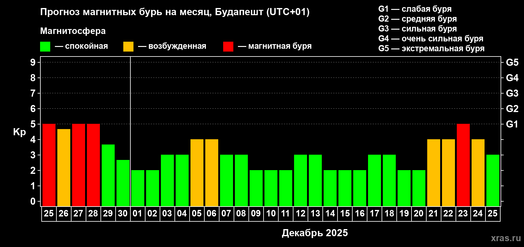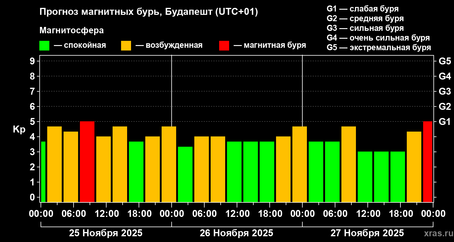 Прогноз магнитных бурь в Будапеште — 25 ноября 2025 года