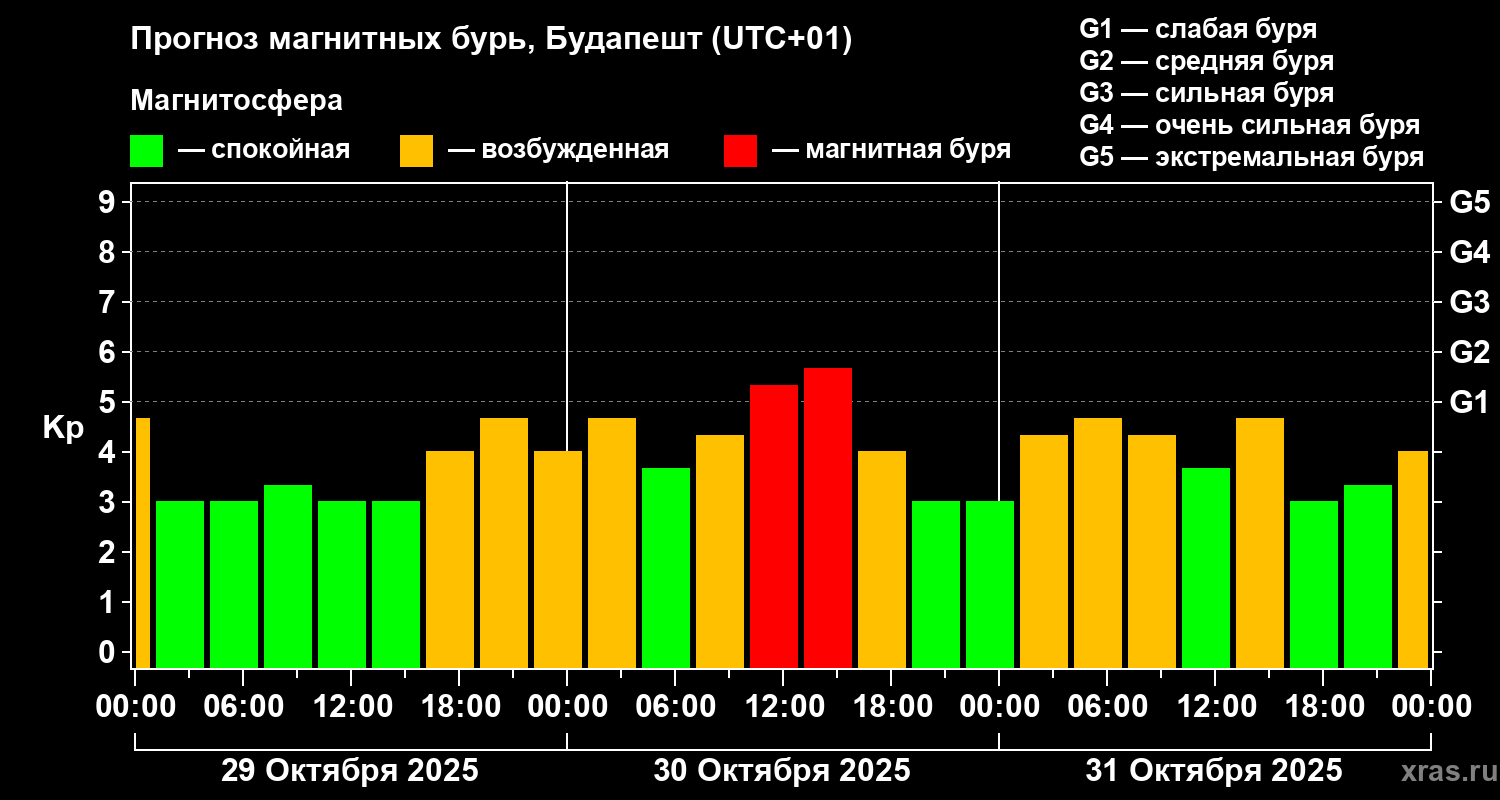 Прогноз магнитных бурь в Будапеште на 29 октября 2025 года