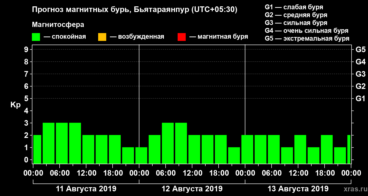 Прогноз магнитных бурь в Бьятараянпуре — 11 августа 2019 года