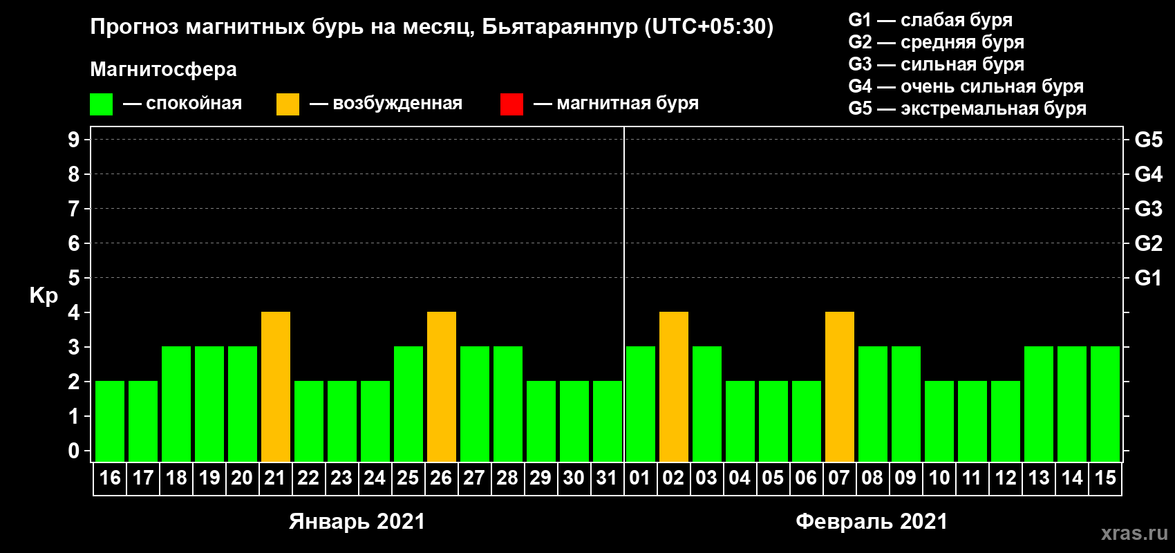 Прогноз магнитных бурь в Бьятараянпуре — 16 января 2021 года