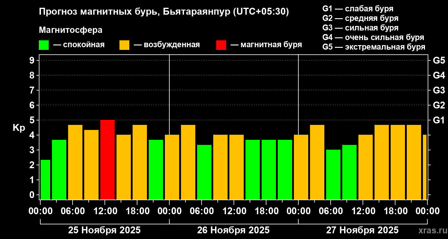Прогноз магнитных бурь в Бьятараянпуре — 25 ноября 2025 года