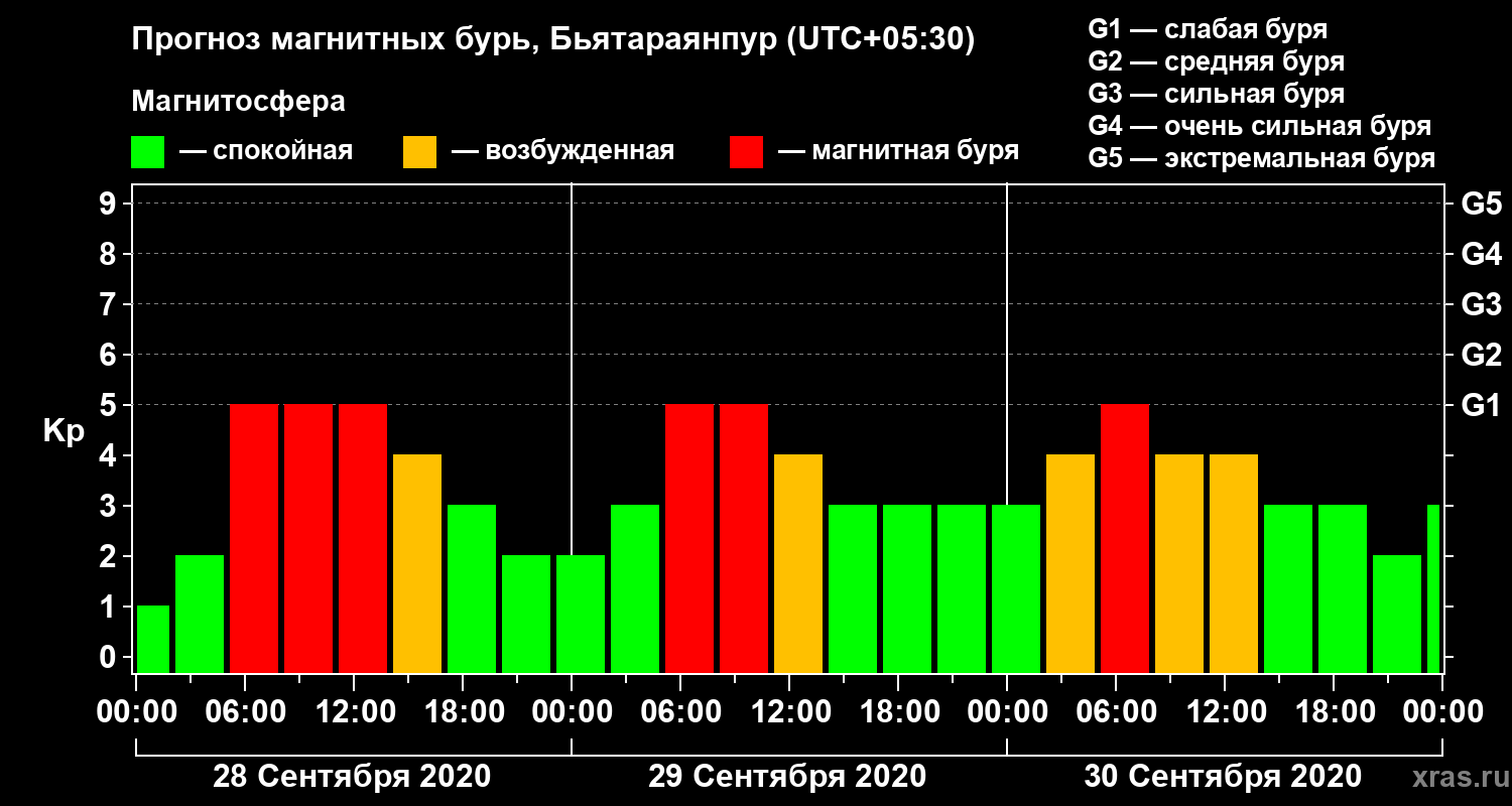Прогноз магнитных бурь в Бьятараянпуре — 28 сентября 2020 года