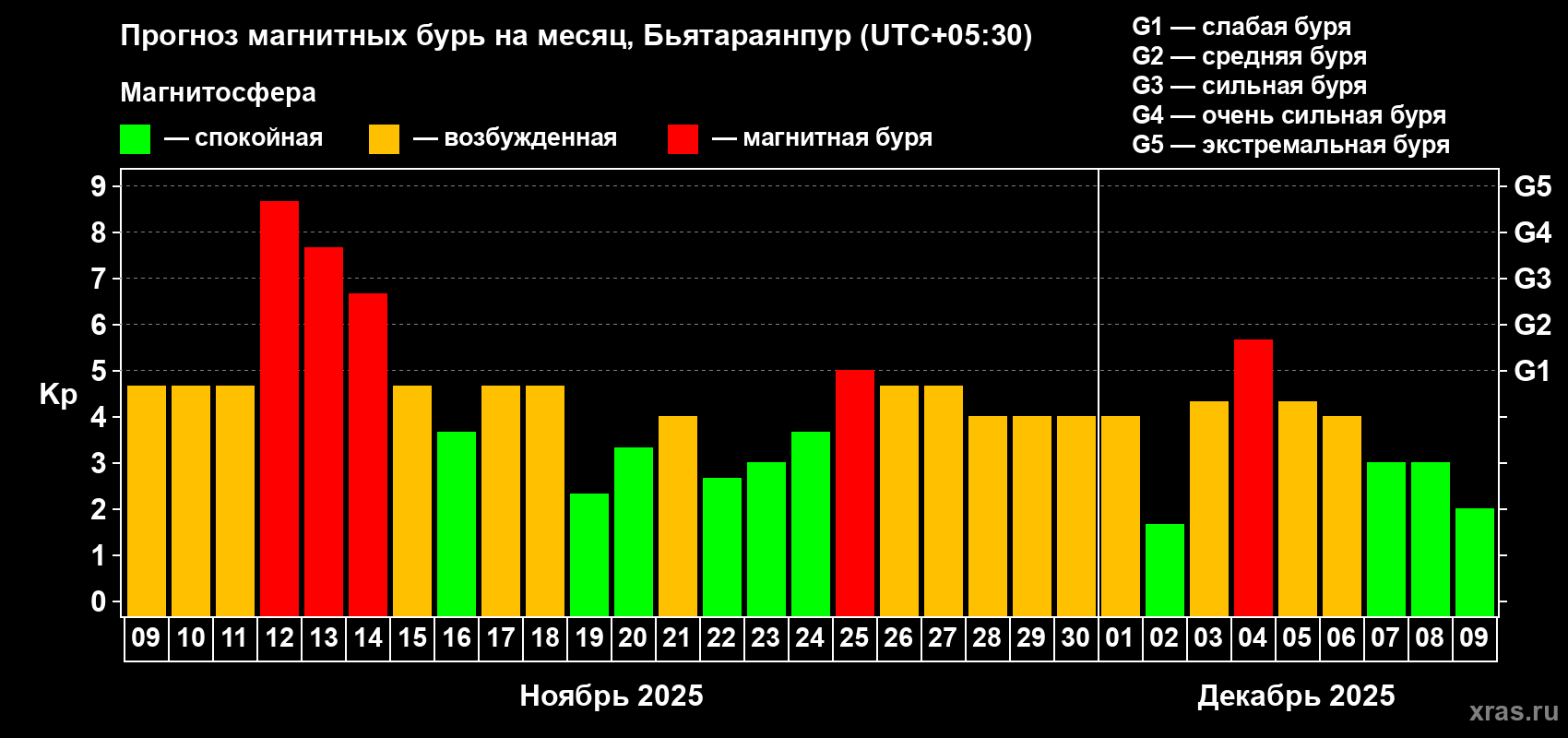 Прогноз магнитных бурь в Бьятараянпуре — 9 ноября 2025 года