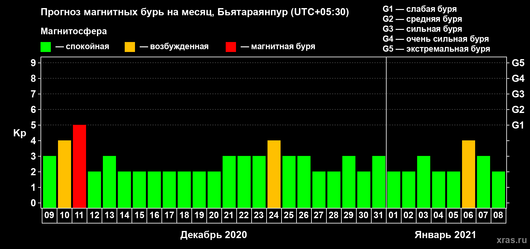Прогноз магнитных бурь в Бьятараянпуре — 9 декабря 2020 года