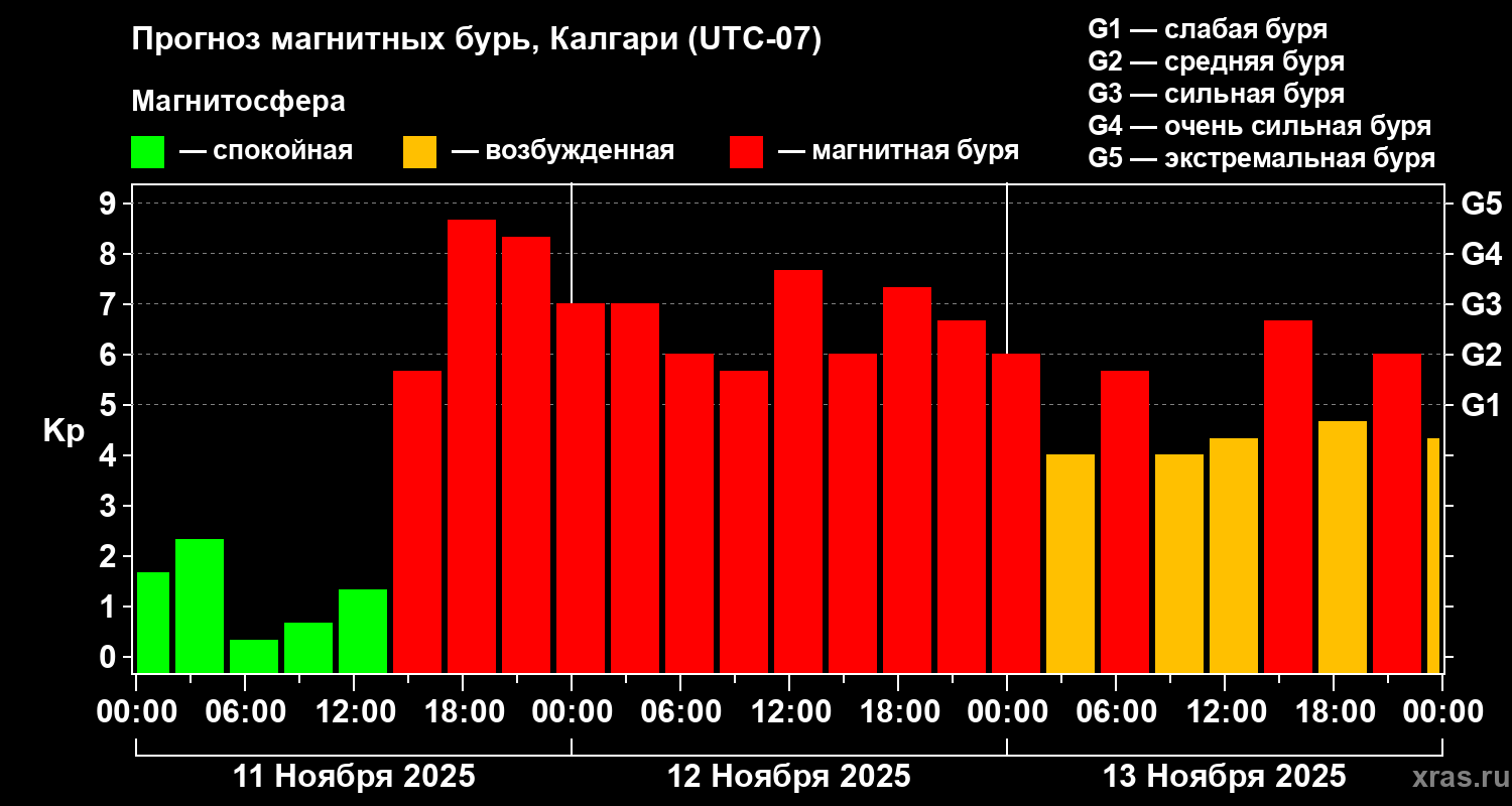 Прогноз магнитных бурь Калгари — 11 ноября 2025 года