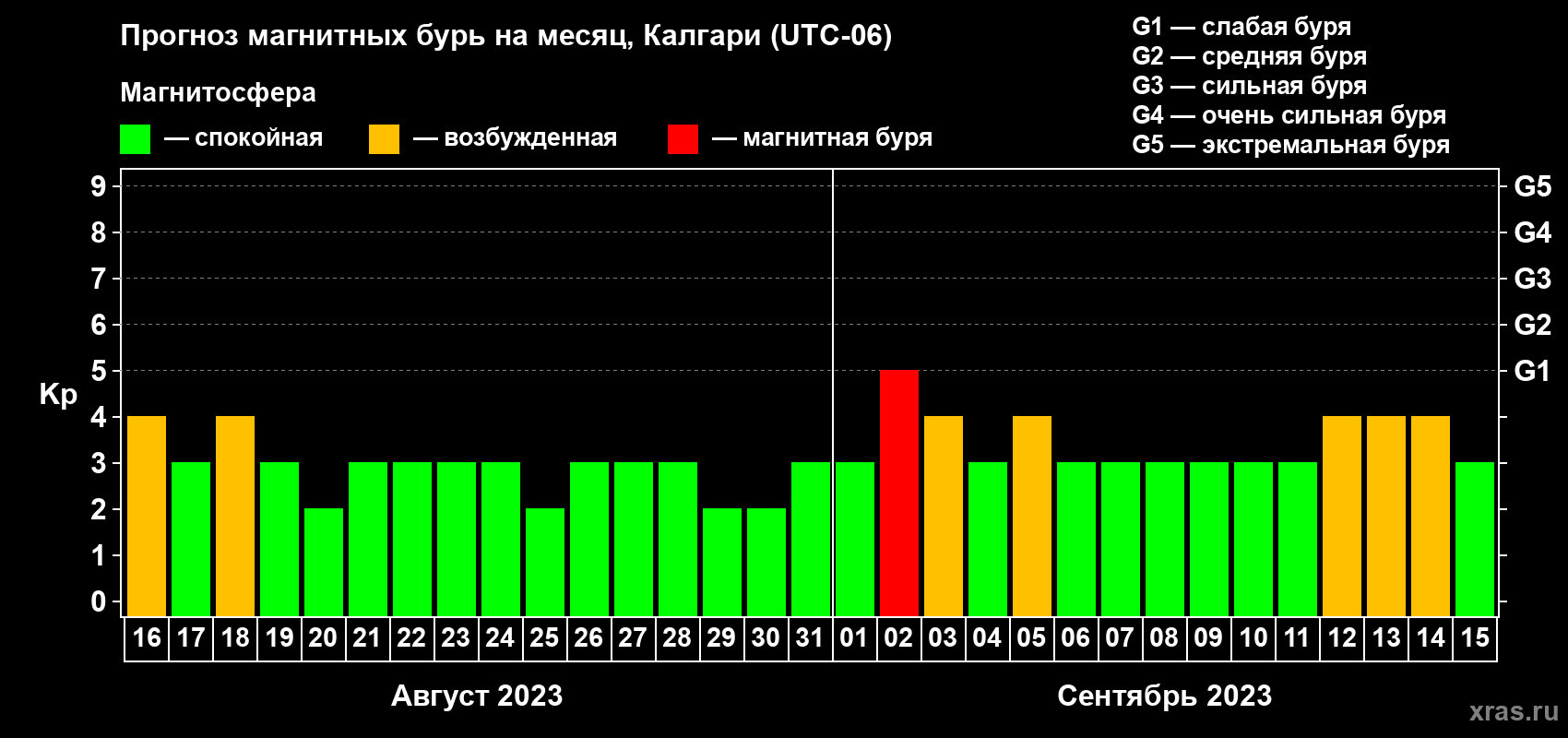 Прогноз магнитных бурь Калгари на 16 августа 2023 года