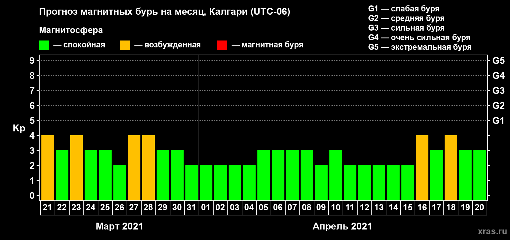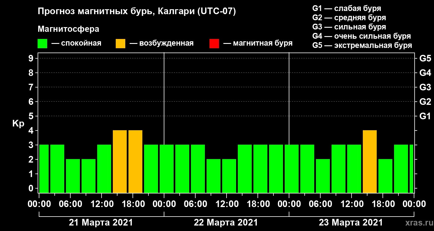 Прогноз магнитных бурь Калгари на 21 марта 2021 года