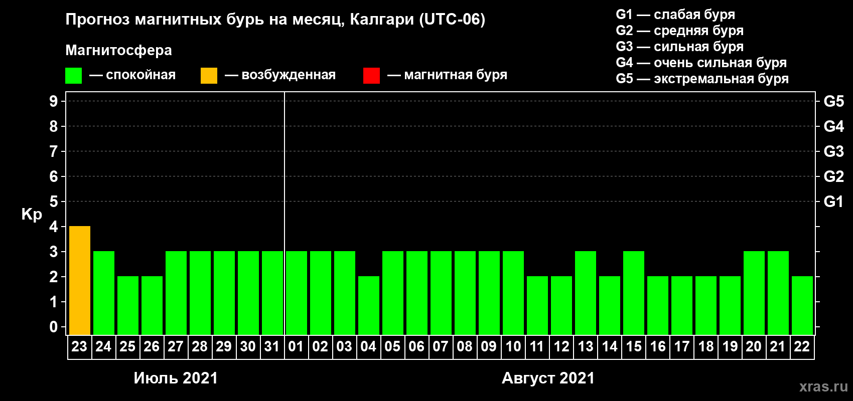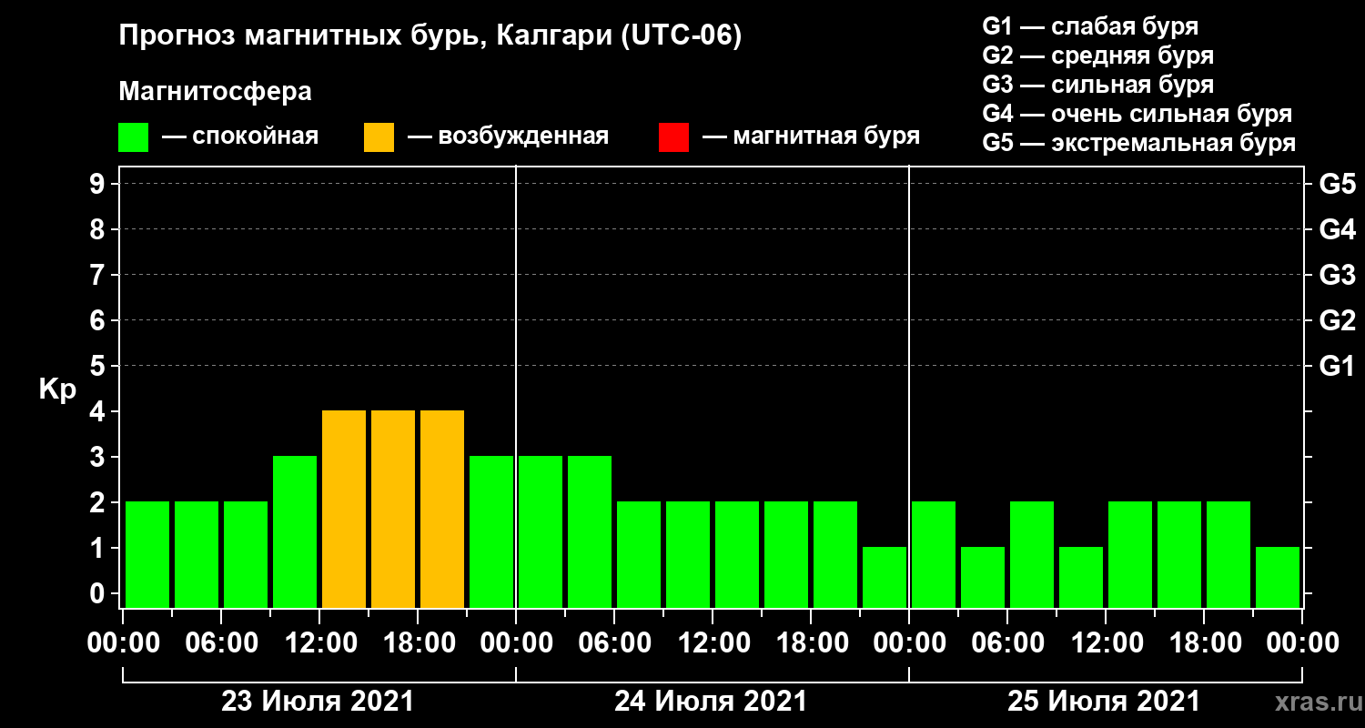 Прогноз магнитных бурь Калгари на 23 июля 2021 года