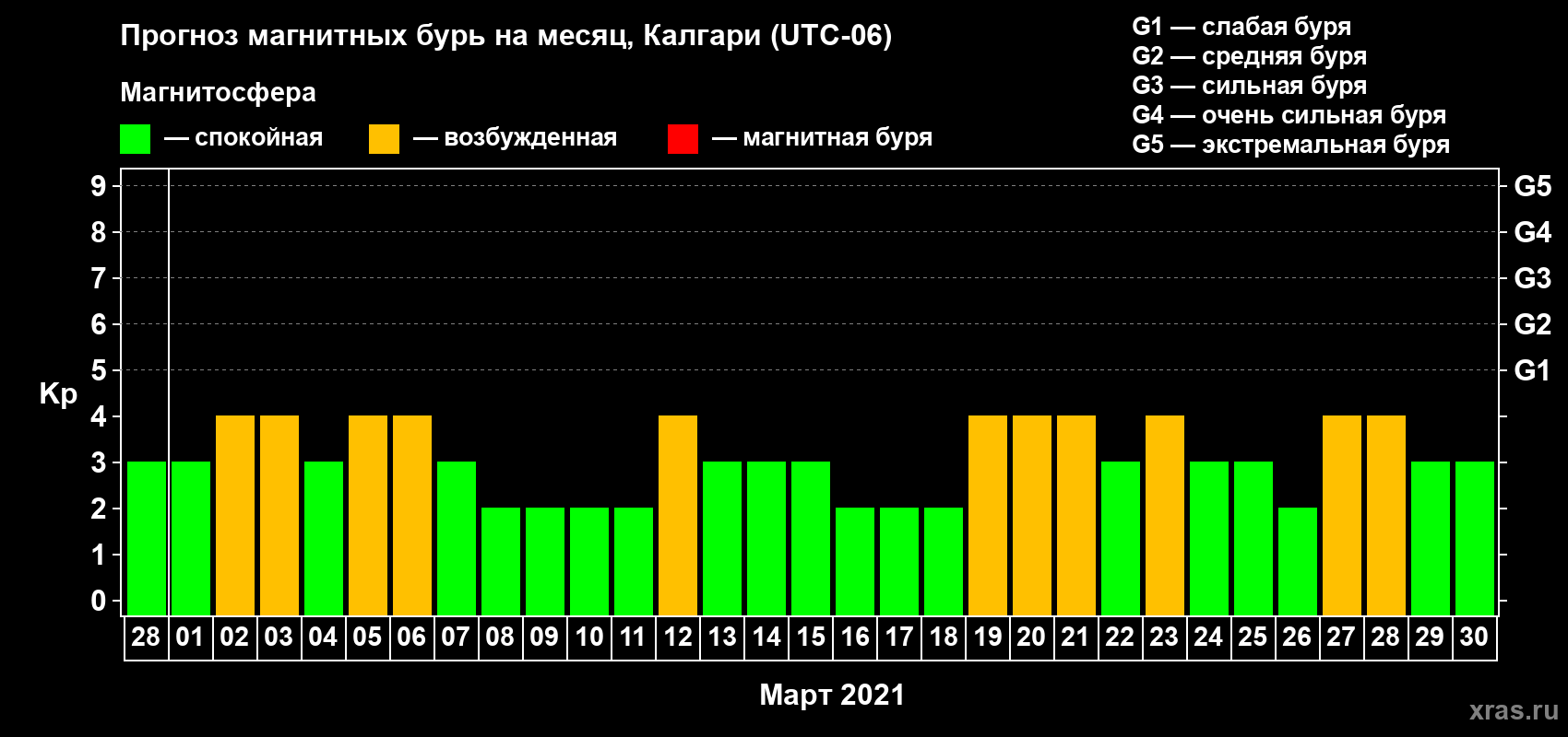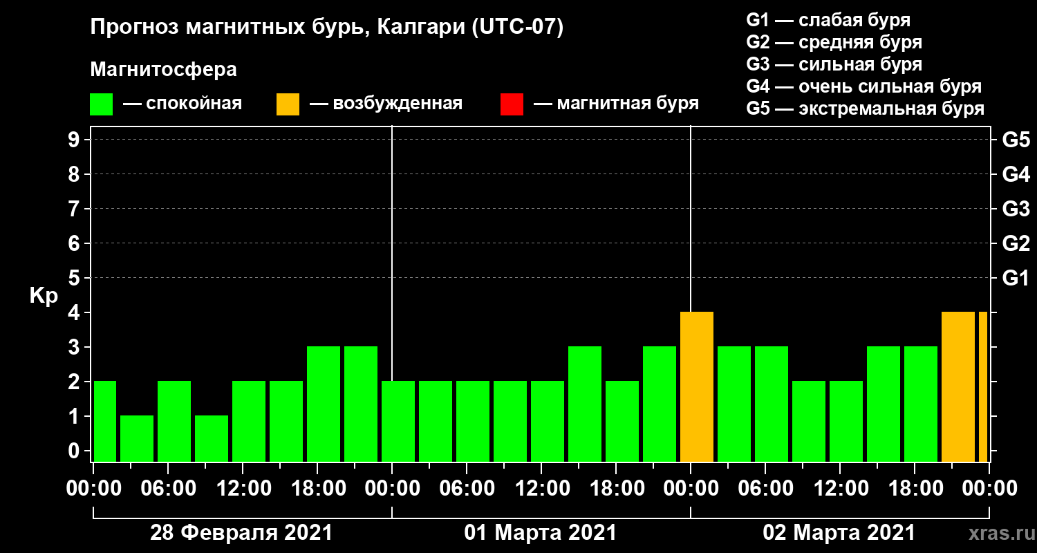 Прогноз магнитных бурь Калгари на 28 февраля 2021 года