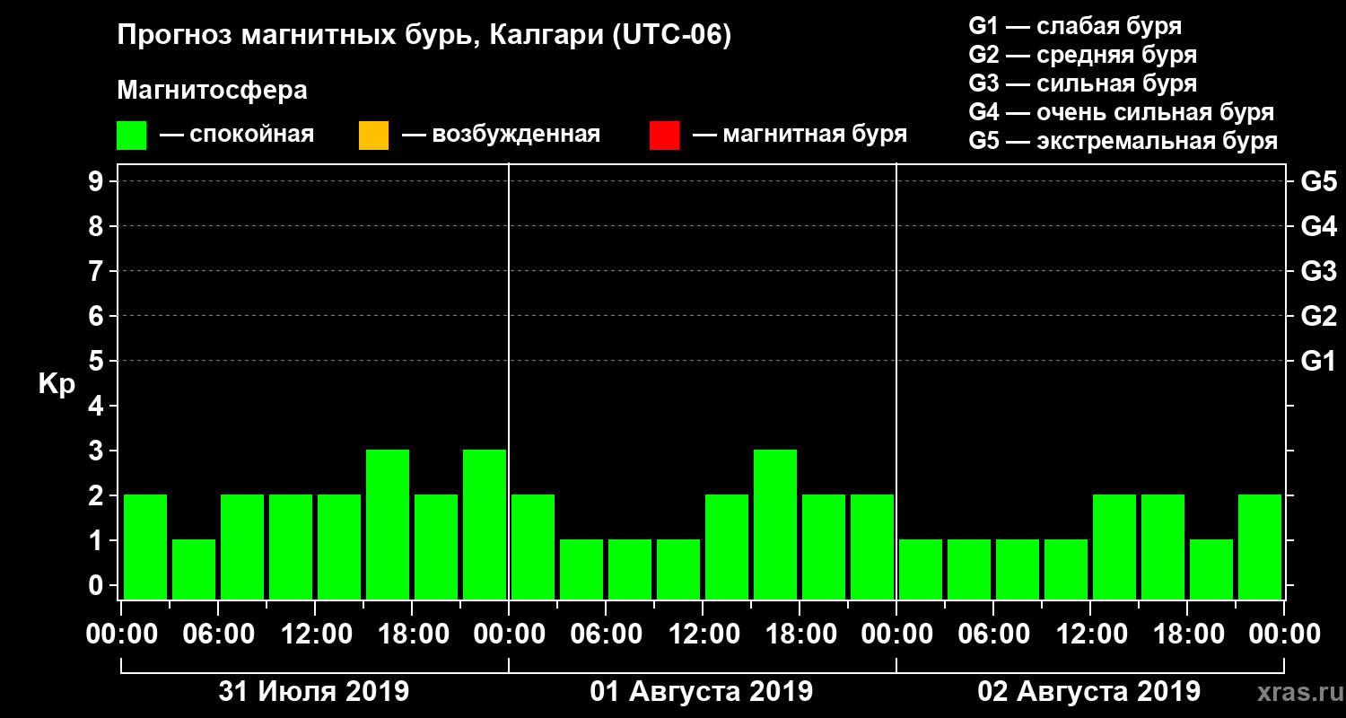 Прогноз магнитных бурь Калгари на 31 июля 2019 года