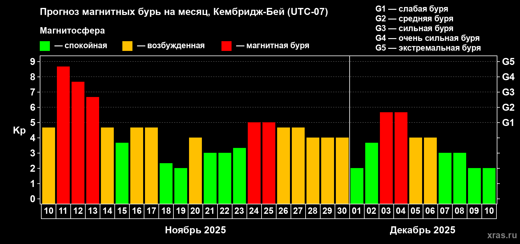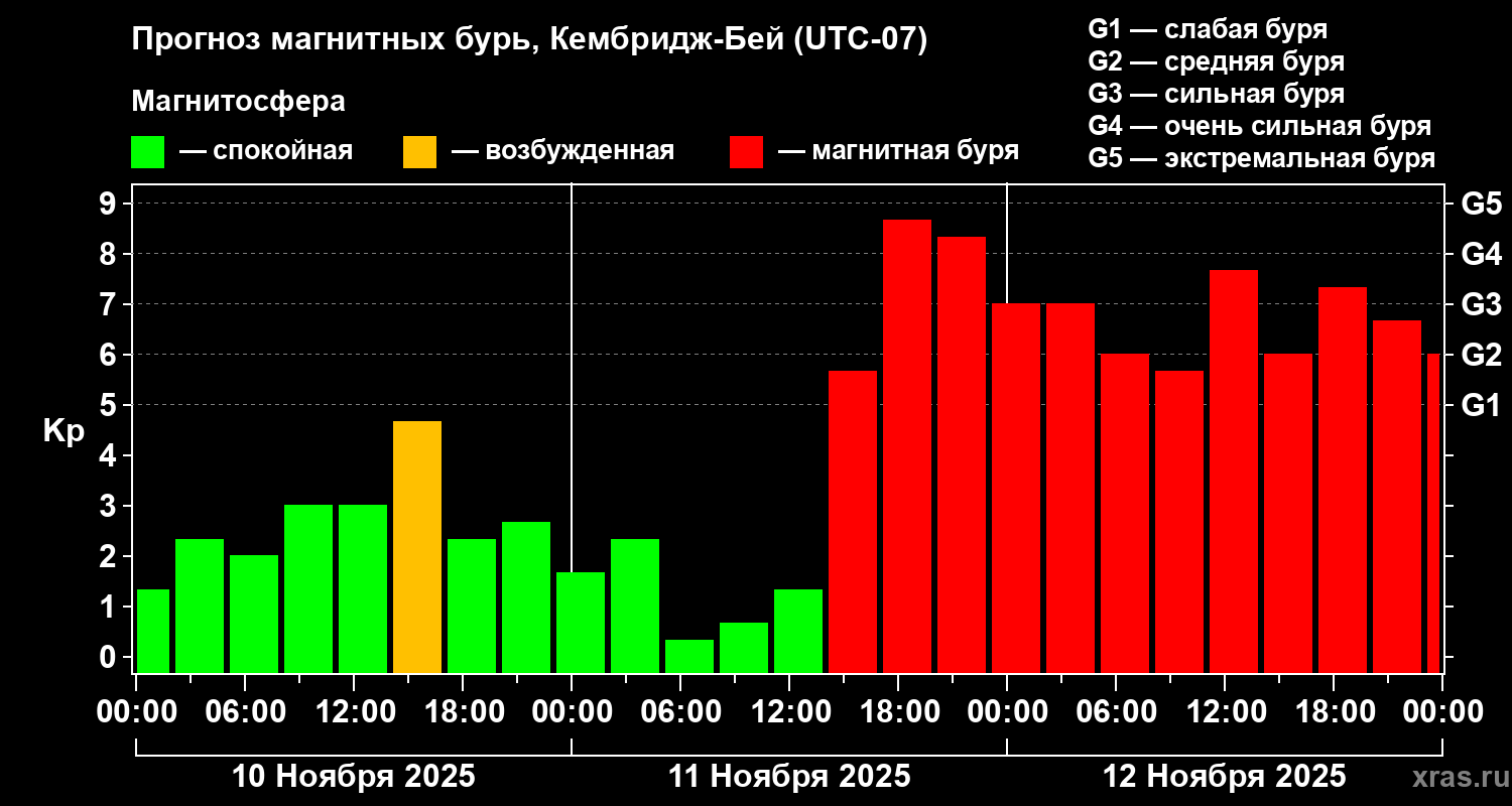 Прогноз магнитных бурь в Кембридж-Бейе — 10 ноября 2025 года