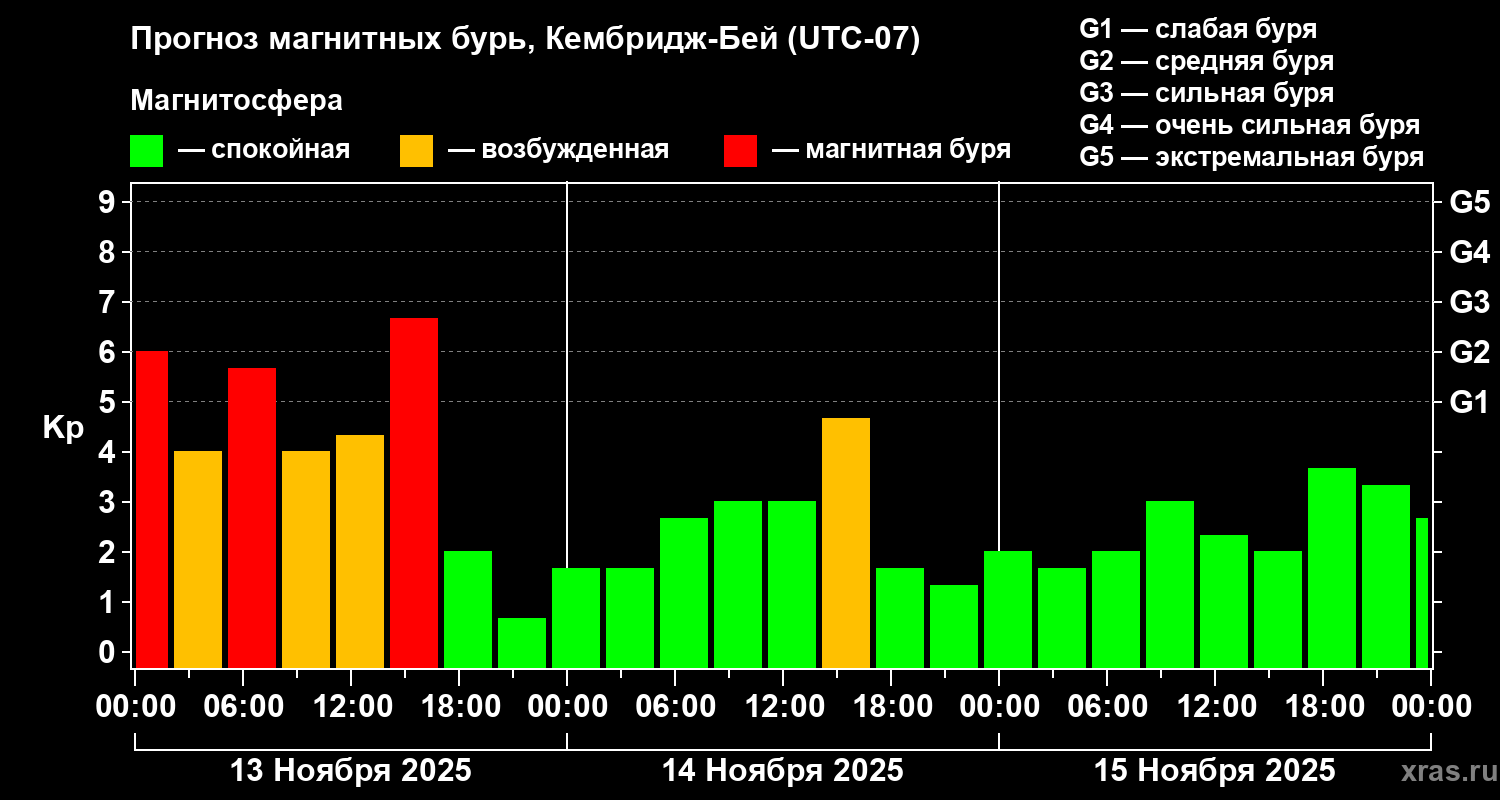 Прогноз магнитных бурь в Кембридж-Бейе — 13 ноября 2025 года