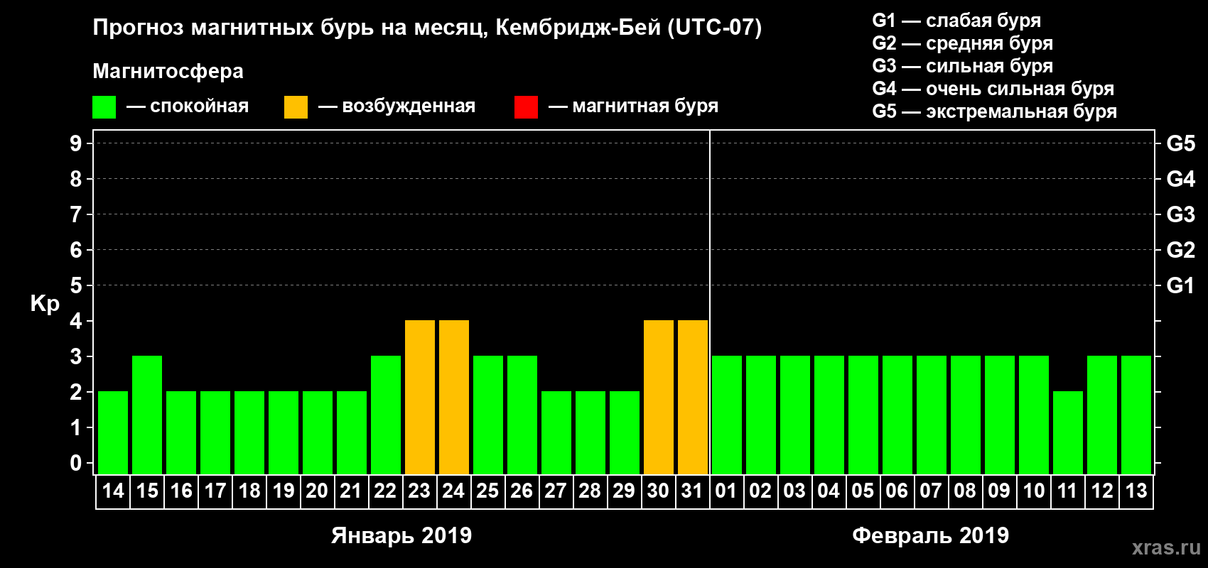 Прогноз магнитных бурь в Кембридж-Бейе — 14 января 2019 года