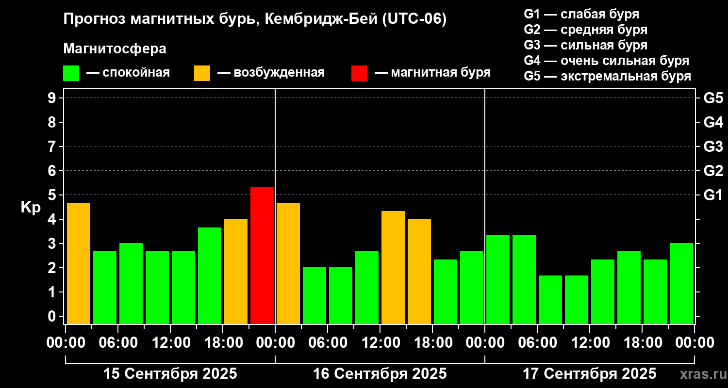 Прогноз магнитных бурь в Кембридж-Бейе на 15 сентября 2025 года
