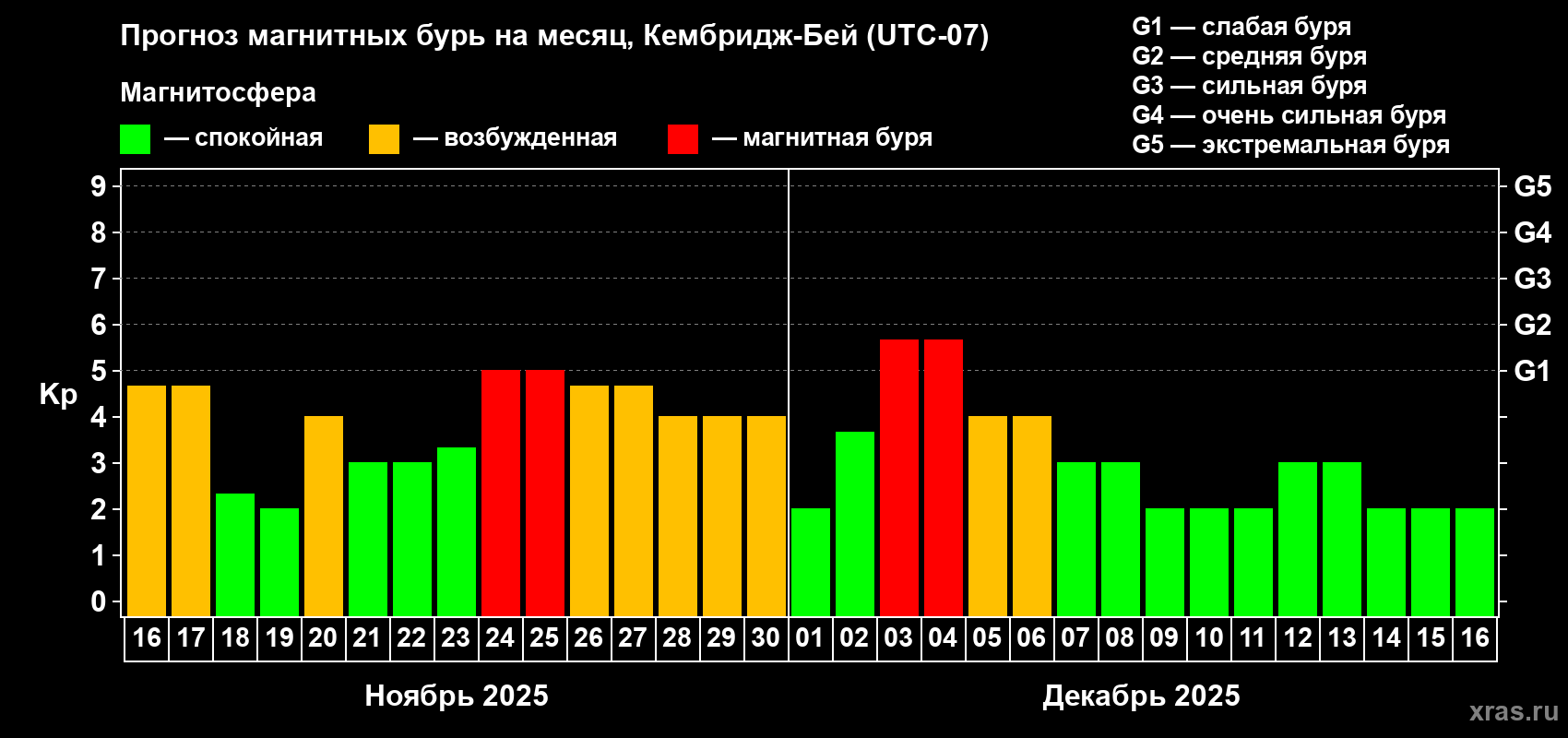 Прогноз магнитных бурь в Кембридж-Бейе — 16 ноября 2025 года