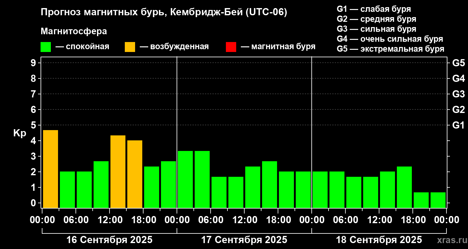 Прогноз магнитных бурь в Кембридж-Бейе на 16 сентября 2025 года