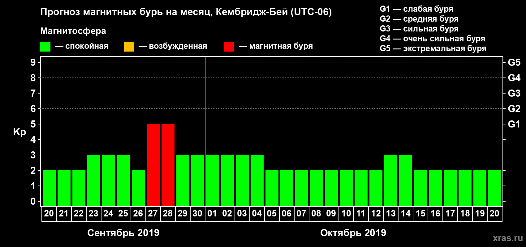 Прогноз магнитных бурь в Кембридж-Бейе — 20 сентября 2019 года