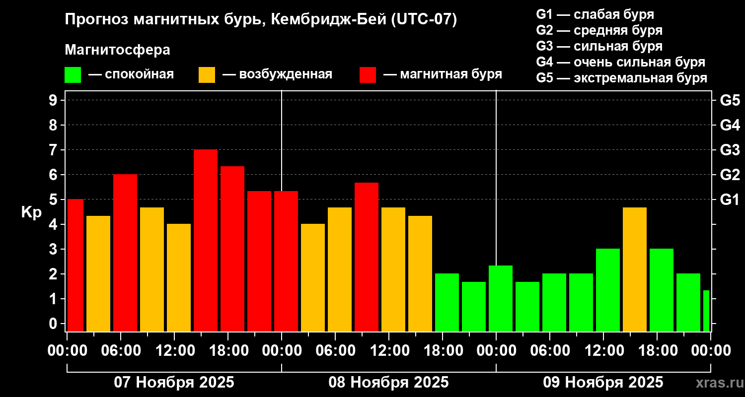 Прогноз магнитных бурь в Кембридж-Бейе — 7 ноября 2025 года