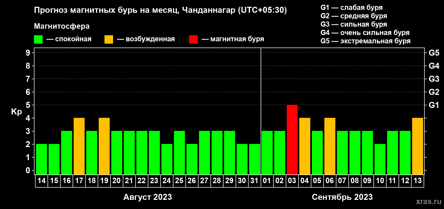 Прогноз магнитных бурь в Чанданнагаре — 14 августа 2023 года
