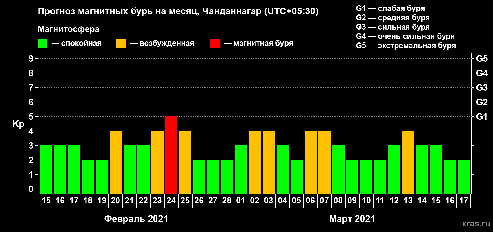 Прогноз магнитных бурь в Чанданнагаре — 15 февраля 2021 года