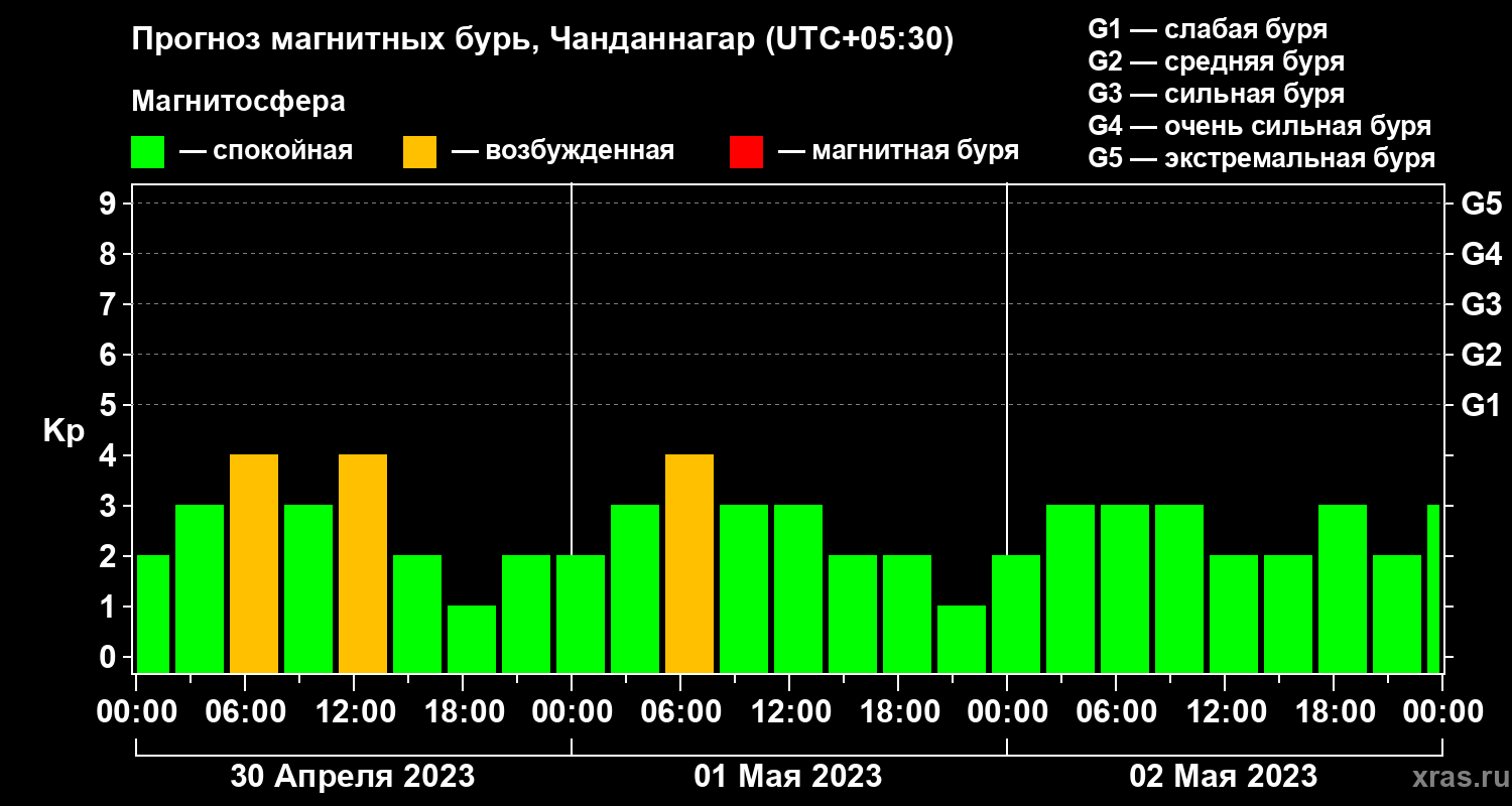 Прогноз магнитных бурь в Чанданнагаре на 30 апреля 2023 года
