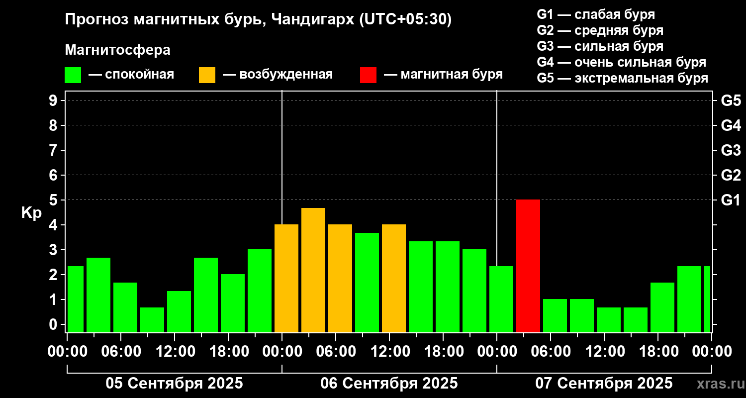 Прогноз магнитных бурь в Чандигархе на 5 сентября 2025 года