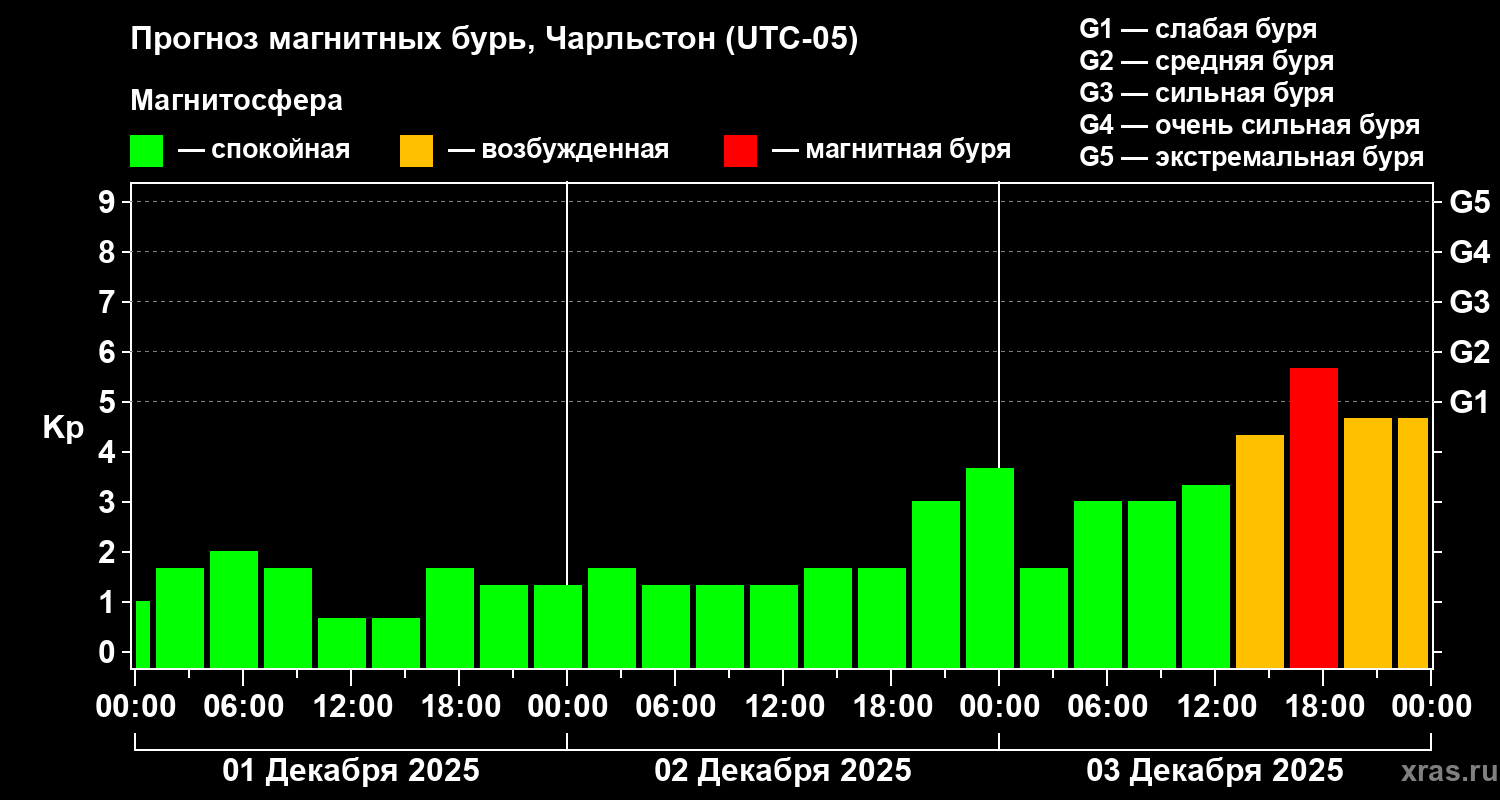 Прогноз магнитных бурь в Чарльстоне на 1 декабря 2025 года